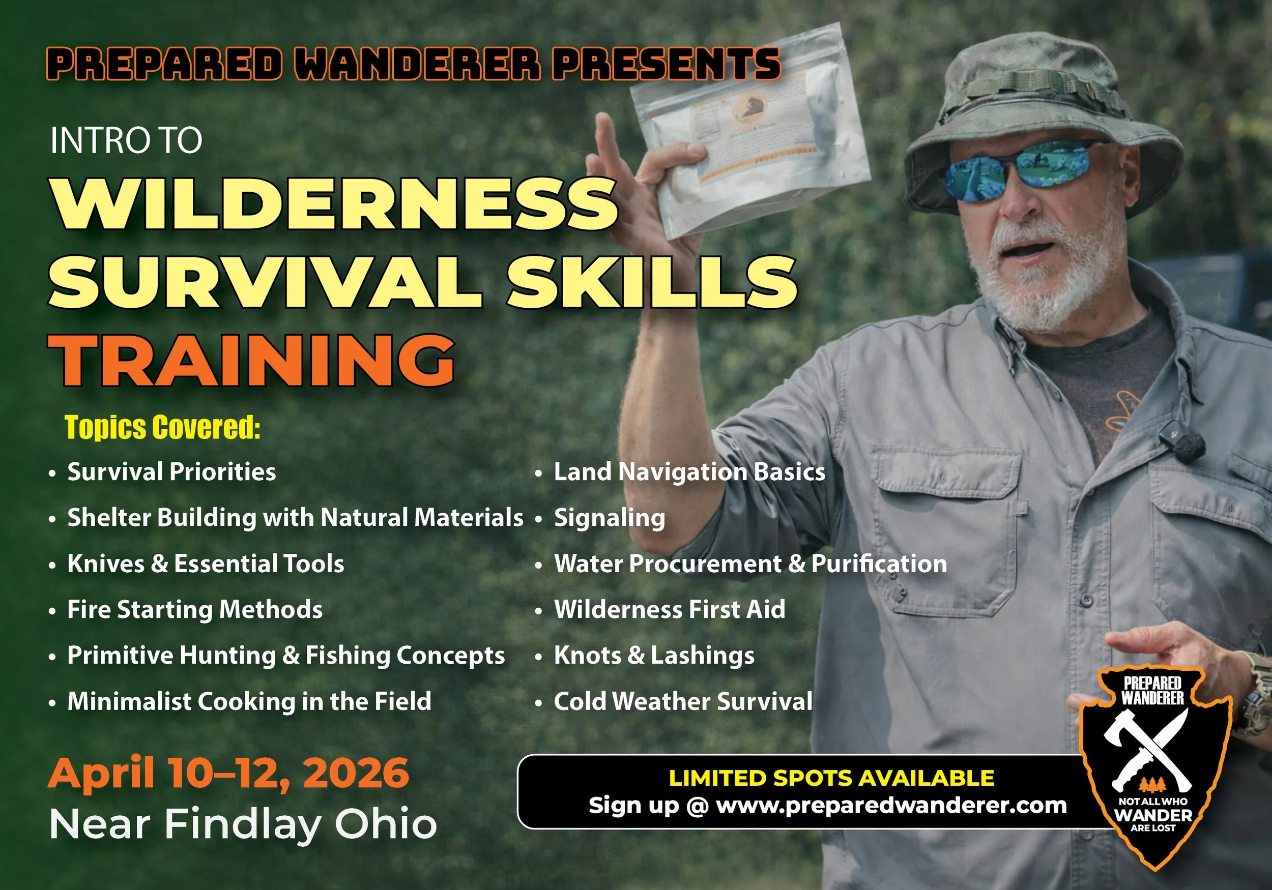 April 10–12, Prepared Wanderer will be hosting our first Intro to Wilderness Survival Skills training on private wooded land near Findlay Ohio.